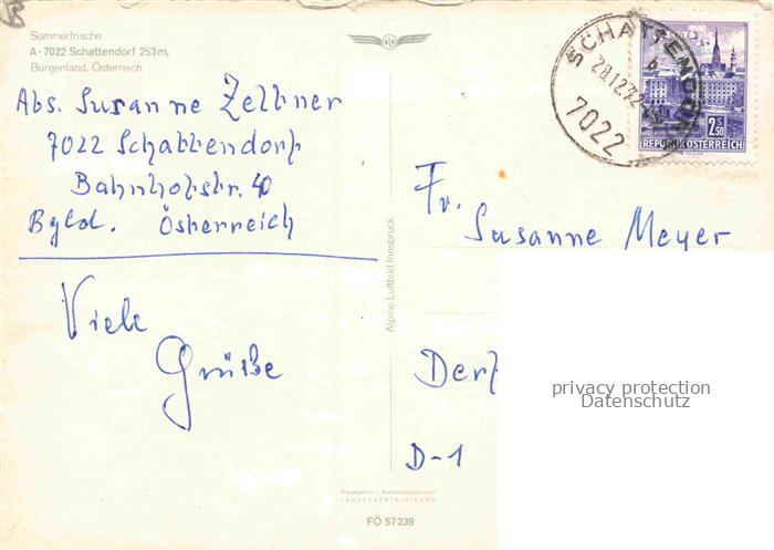 74156467 alte Postkarte Schattendorf Burgenland AT Fliegeraufnahme Dorfansicht Felder Kirche Wohnhaeuser Wappen Baeume postalisch gelaufen Fliegeraufnahme Erhaltung siehe scans [Karloger] KatCode: 11390112010612