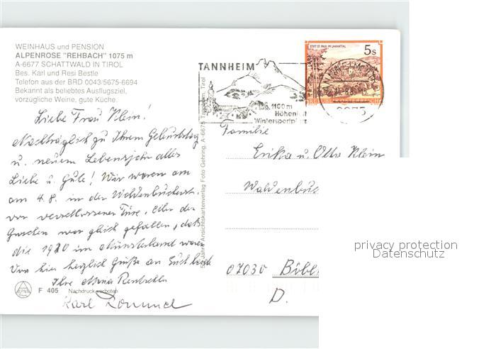 72256909 alte Postkarte Schattwald Weinhaus Pension Alpenrose Rehbach postalisch gelaufen Erhaltung siehe scans KatCode: 11390331070829