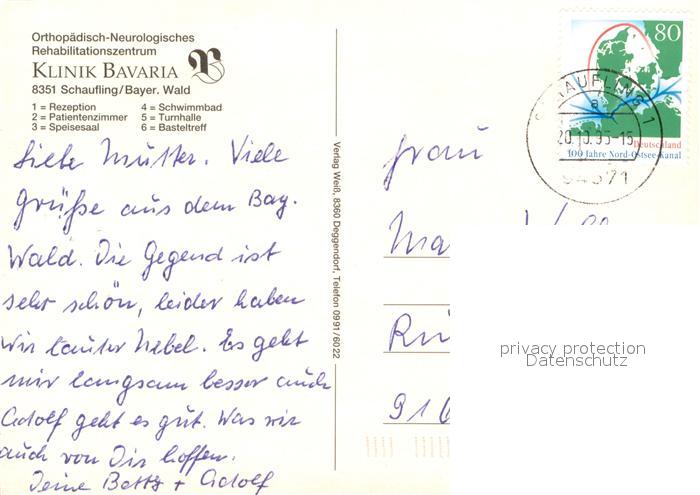 73617795 alte Postkarte Schaufling Klinik Bavaria Rezeption Patientenzimmer Speisesaal Schwimmbad Turnhalle Basteltreff postalisch gelaufen Erhaltung siehe scans [WerneD78] KatCode: 11110009271148