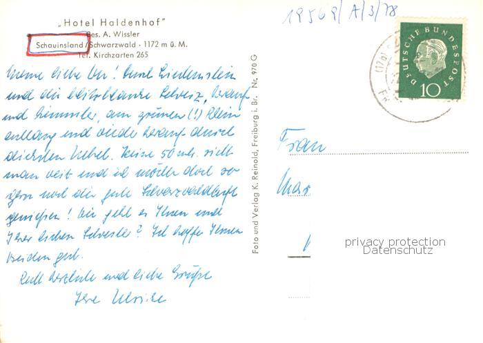 73759969 alte Postkarte Schauinsland Hotel Haldenhof postalisch gelaufen Erhaltung siehe scans [FriedD77] KatCode: 11110008315084