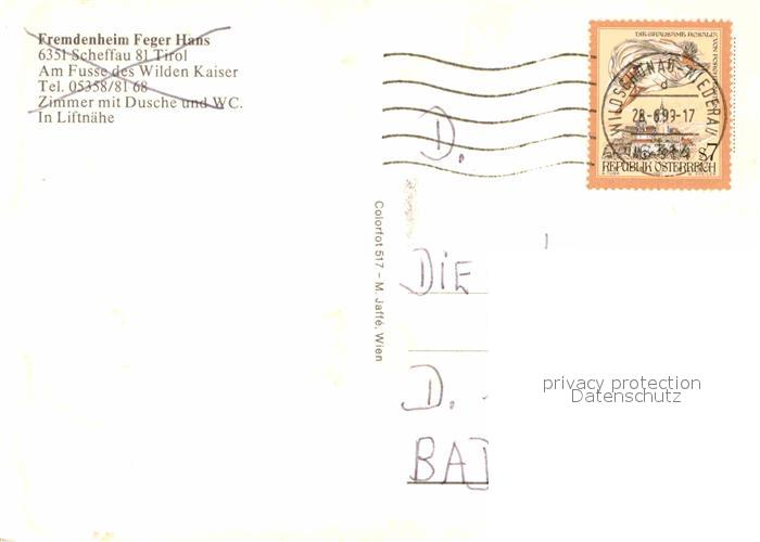 72713097 alte Postkarte Scheffau Wilden Kaiser Fremdenheim Feger Hans postalisch gelaufen Erhaltung siehe scans [LiesaD40] KatCode: 11390335070524