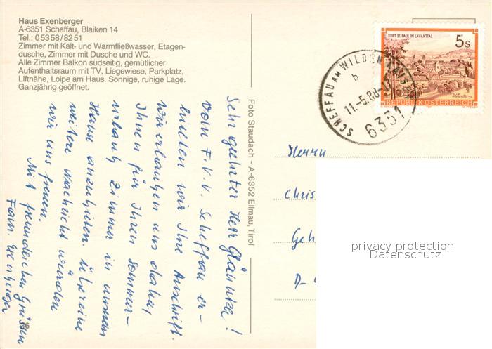 73642813 alte Postkarte Scheffau Wilden Kaiser Gaestehaus Pension Haus Exenberger postalisch gelaufen Erhaltung siehe scans [FriedD77] KatCode: 11390335070524