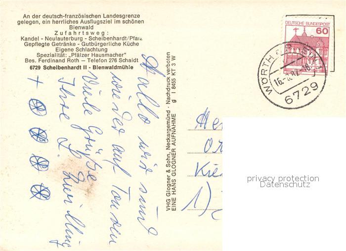 73716932 alte Postkarte Scheibenhardt Pfalz Gaststaette Bienwaldmuehle Gartenterrasse Partie am Bach postalisch gelaufen Erhaltung siehe scans [FriedD77] KatCode: 11110007334027