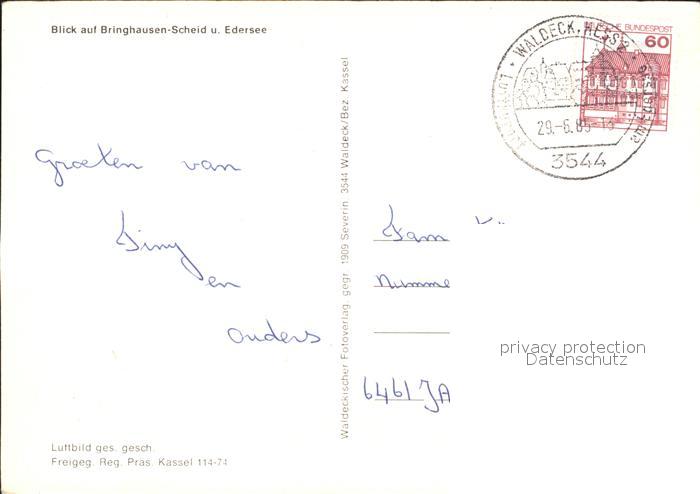 72232594 alte Postkarte Scheid Hessen Blick auf Bringhausen und Edersee Fliegeraufnahme postalisch gelaufen Erhaltung siehe scans KatCode: 11110006635021