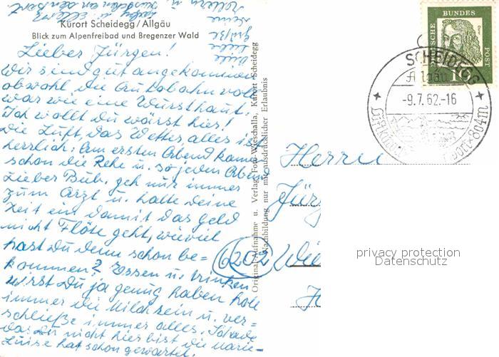 72905461 alte Postkarte Scheidegg Allgaeu Alpenfreibad Hirschberg Hoher Freschen postalisch gelaufen Erhaltung siehe scans [NatalD47] KatCode: 11110009776125