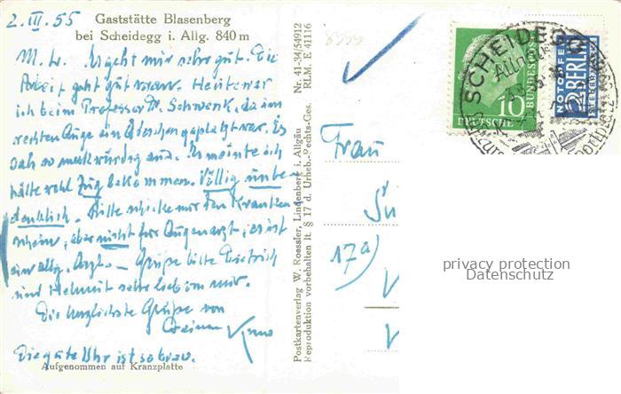 74101249 alte Postkarte Scheidegg Allgaeu Bayern Blick vom Blasenberg Panorama Gaststaette Blasenberg postalisch gelaufen Erhaltung siehe scans [WerneD78] KatCode: 11110009776125