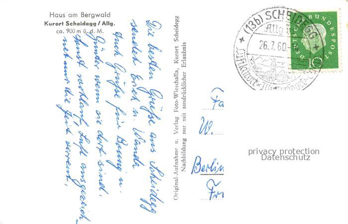74037629 alte Postkarte Scheidegg Allgaeu Bayern Gesamtansicht mit Alpenpanorama Gaestehaus Haus am Bergwald postalisch gelaufen Erhaltung siehe scans [FriedD77] KatCode: 11110009776125