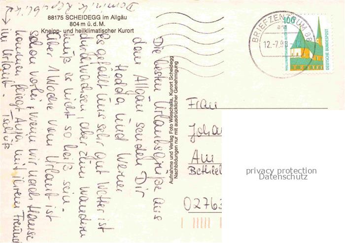 74137975 Scheidegg Allgaeu Bayern Wasserfall Kutschfahrt Panorama postalisch gelaufen Erhaltung siehe scans [FriedD77] alte Postkarte Frie Katcode 11110009776125