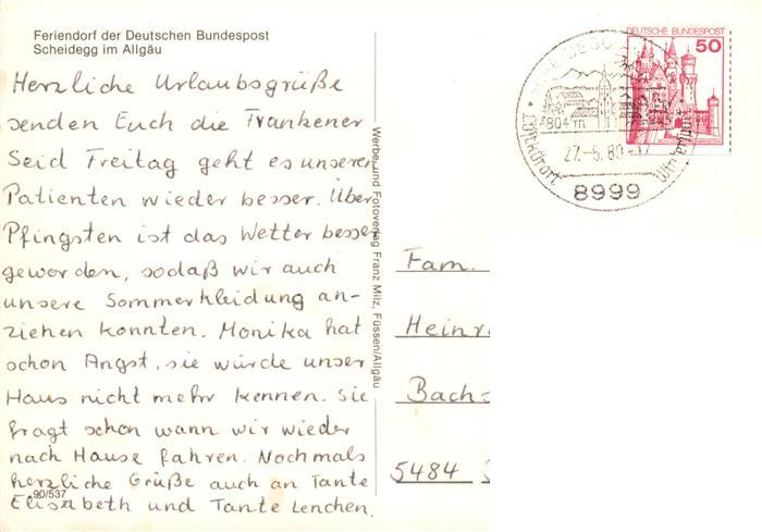 73878504 alte Postkarte Scheidegg Allgaeu Feriendorf der Deutschen Bundespost postalisch gelaufen Erhaltung siehe scans [WerneD78] KatCode: 11110009776125