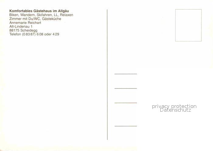 72668972 Scheidegg Allgaeu Gaestehaus im Allgaeu Annemarie Reichart postalisch nicht gelaufen Erhaltung siehe scans [LiesaD40] KatCode: 11110009776125