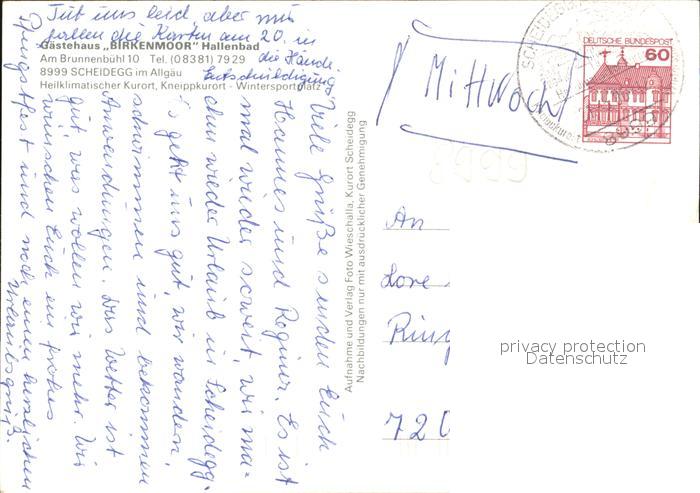 72421220 alte Postkarte Scheidegg Allgaeu Haus Birkenmoor Hallenbad postalisch gelaufen Erhaltung siehe scans KatCode: 11110009776125
