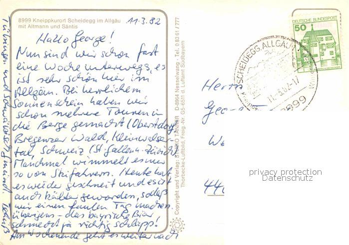 72831888 alte Postkarte Scheidegg Allgaeu Kneippkurort mit Altmann und Saentis Appenzeller Alpen Fliegeraufnahme postalisch gelaufen Erhaltung siehe scans [FriedD77] KatCode: 11110009776125