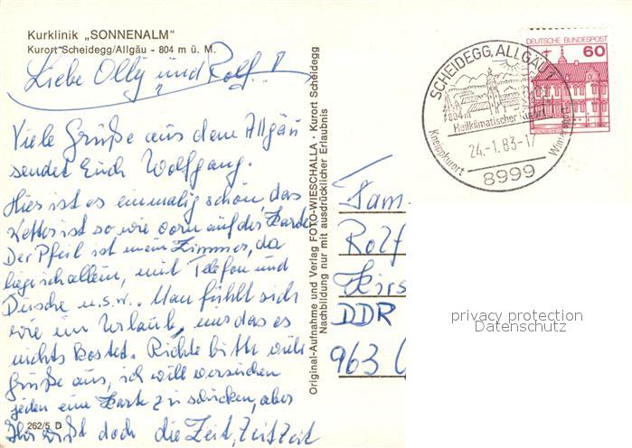 73304517 alte Postkarte Scheidegg Allgaeu Kurklinik Sonnenalm Winterpanorama Allgaeuer Alpen postalisch gelaufen Erhaltung siehe scans [FriedD77] KatCode: 11110009776125
