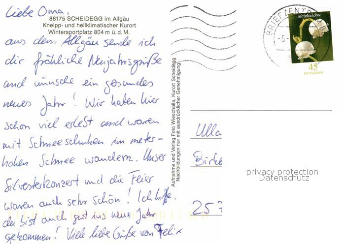 72791773 alte Postkarte Scheidegg Allgaeu Ortsmotiv mit Kirche Kurort Wintersportplatz Langlaufloipe Eiszapfen Wasserfall postalisch gelaufen Erhaltung siehe scans [FriedD77] KatCode: 11110009776125