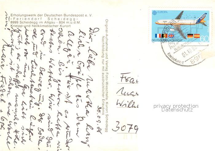 73688038 alte Postkarte Scheidegg Allgaeu Panorama Erholungswerk der Deutschen Bundespost Feriendorf Scheidegg postalisch gelaufen Erhaltung siehe scans [WerneD78] KatCode: 11110009776125
