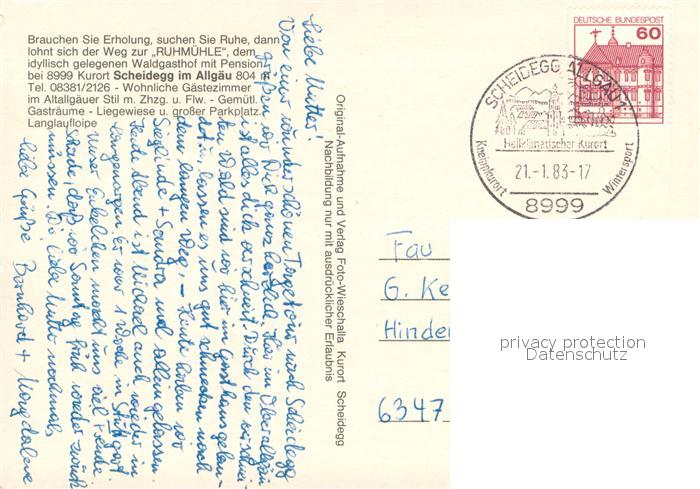 73715996 alte Postkarte Scheidegg Allgaeu Panorama Waldgasthof Ruhmuehle Gaststube Kaminzimmer postalisch gelaufen Erhaltung siehe scans [WerneD78] KatCode: 11110009776125