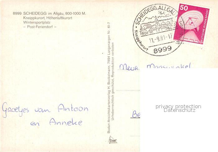 72930871 alte Postkarte Scheidegg Allgaeu Post-Feriendorf postalisch gelaufen Erhaltung siehe scans [LiesaD40] KatCode: 11110009776125