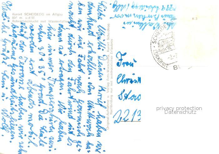 73062181 alte Postkarte Scheidegg Allgaeu Rohrachschlucht mit Wasserfaellen Panorama Tierpark postalisch gelaufen Erhaltung siehe scans [WerneD78] KatCode: 11110009776125