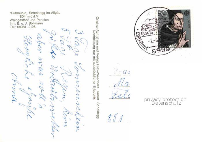 72698940 alte Postkarte Scheidegg Allgaeu Ruhmuehle Waldgasthof Pension postalisch gelaufen Erhaltung siehe scans [KathaD79] KatCode: 11110009776125