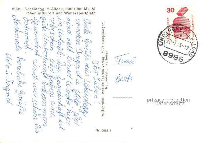72625752 alte Postkarte Scheidegg Allgaeu Volksschule Rathaus Kurhotel Gesamtansicht Luftkurort postalisch gelaufen Erhaltung siehe scans [FriedD77] KatCode: 11110009776125