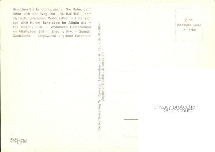 72543779 Scheidegg Allgaeu Waldgasthof Ruehmuehle postalisch nicht gelaufen Erhaltung siehe scans [LiesaD40 kv019box] KatCode: 11110009776125
