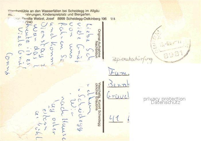 72742171 alte Postkarte Scheidegg Allgaeu Wanderstueble an den Wasserfaellen Ferienwohnung Picknickplatz Kiosk Biergarten Ponyreiten Allgaeuer Alpen postalisch gelaufen Erhaltung siehe scans [FriedD77] KatCode: 11110009776125