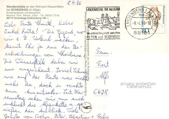 73736942 alte Postkarte Scheidegg Allgaeu Wanderstueble Rohrach-Wasserfaelle Winter Schnee postalisch gelaufen Erhaltung siehe scans [LiesaD40] KatCode: 11110009776125