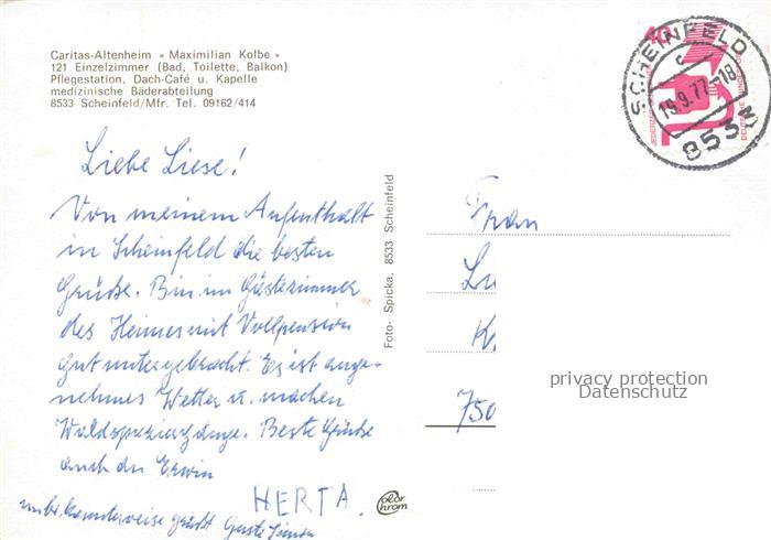 74049951 alte Postkarte Scheinfeld Steigerwald Bayern Caritas Altenheim Maximilian Kolbe Hallenbad postalisch gelaufen Erhaltung siehe scans [FriedD77] KatCode: 11110009575161