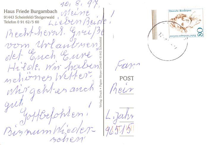73942644 alte Postkarte Scheinfeld Steigerwald Bayern Panorama Haus Friede im Steigerwald postalisch gelaufen Erhaltung siehe scans [FriedD77] KatCode: 11110009575161