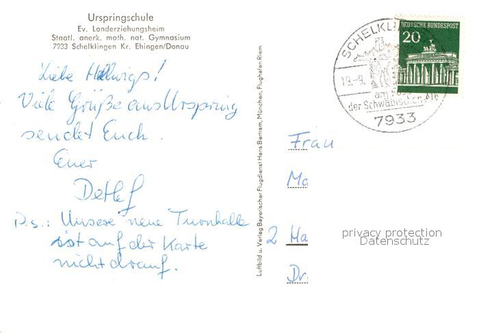 72951912 alte Postkarte Schelklingen Urspringschule Fliegeraufnahme postalisch gelaufen Erhaltung siehe scans [PaolaD17] KatCode: 11110008425108