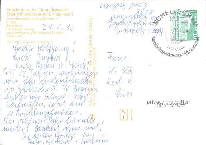 72368820 alte Postkarte Schellerhau Jugendherberge Georg Schumann Kirche Bergklause Betriebsferienheim VEB Dresden Teilansicht postalisch gelaufen Erhaltung siehe scans KatCode: 11110014290010