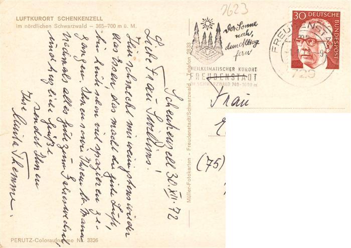 73930365 alte Postkarte Schenkenzell Panorama Teilansichten Luftkurort Holzfigur postalisch gelaufen Erhaltung siehe scans [FriedD77] KatCode: 11110008325050