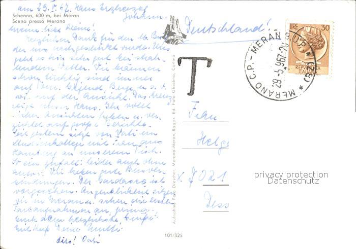 old postcard Schenna Meran Gesamtansicht mit Alpenpanorama postalisch gelaufen Erhaltung siehe scans