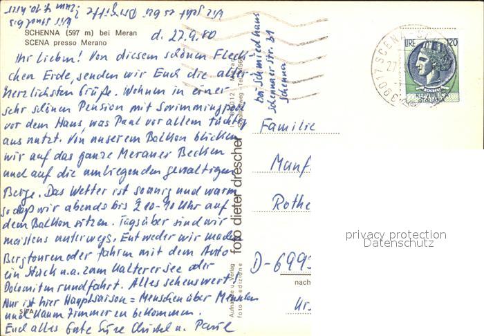 old postcard Schenna Meran Gesamtansicht mit Alpenpanorama postalisch gelaufen Erhaltung siehe scans