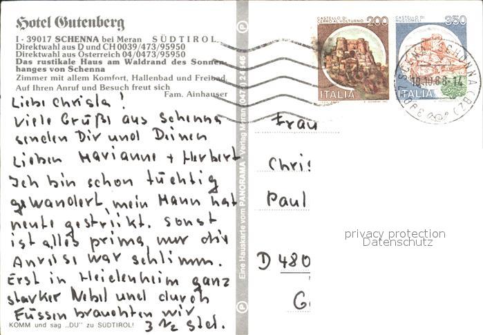 old postcard Schenna Meran Hotel Gutenberg postalisch gelaufen Erhaltung siehe scans