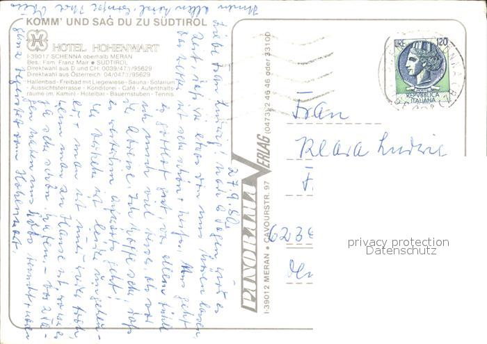 old postcard Schenna Meran Hotel Hohenwart postalisch gelaufen Erhaltung siehe scans