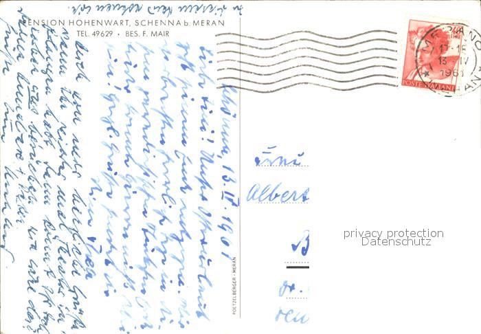 old postcard Schenna Meran Pension Hohenwart postalisch gelaufen Erhaltung siehe scans