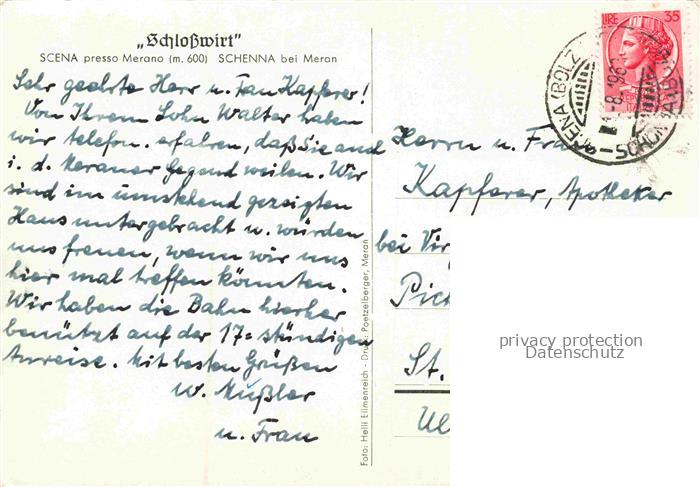 74079676 old postcard Schenna Meran Trentino IT Albergo Schlosswirt postalisch gelaufen Erhaltung siehe scans [WerneD78] KatCode: 11240