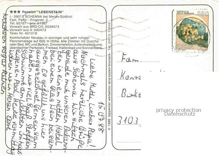 74132364 old postcard Schenna Meran Trentino IT Pension Lebenstain Swimming Pool postalisch gelaufen Erhaltung siehe scans [FriedD77] KatCode: 11240