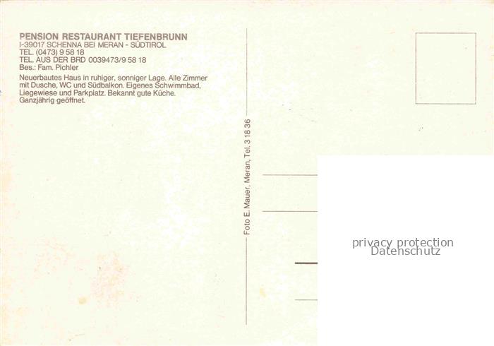 74110353 Schenna Meran Trentino IT Pension Restaurant Tiefenbrunn postalisch nicht gelaufen Erhaltung siehe scans [WerneD78] KatCode: 11240