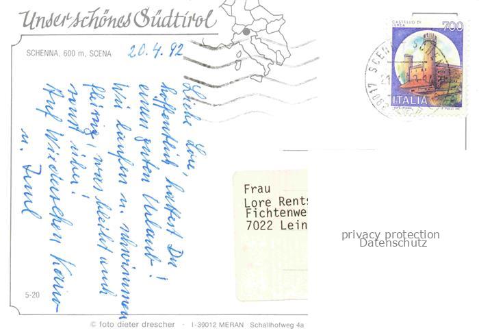 74079536 old postcard Schenna Meran Trentino IT Teilansicht Kirche Schloss postalisch gelaufen Erhaltung siehe scans [FriedD77] KatCode: 11240