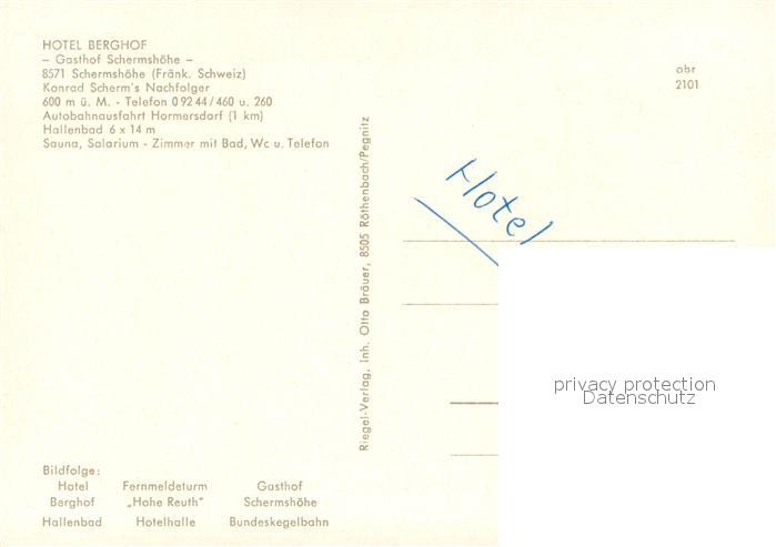 73641399 Schermshoehe Gasthof Hotel Berghof Hallenbad Kegelbahn Sender Fraenkische Schweiz postalisch nicht gelaufen Erhaltung siehe scans [FriedD77] KatCode: 11110009472177