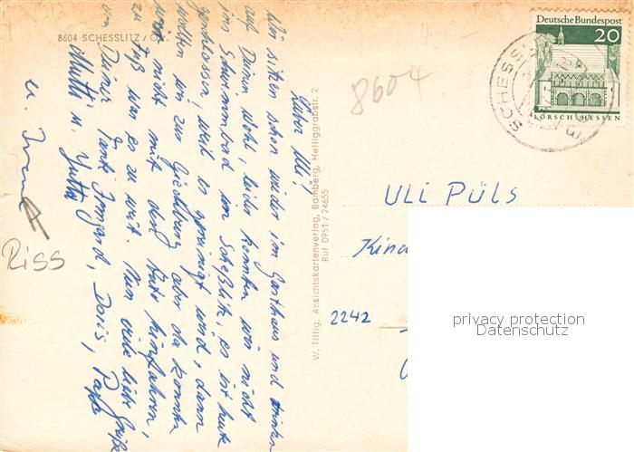 73873851 alte Postkarte Schesslitz Hauptstrasse Panorama Dillighaus Kath Pfarrkirche postalisch gelaufen Erhaltung siehe scans [WerneD78] KatCode: 11110009471185