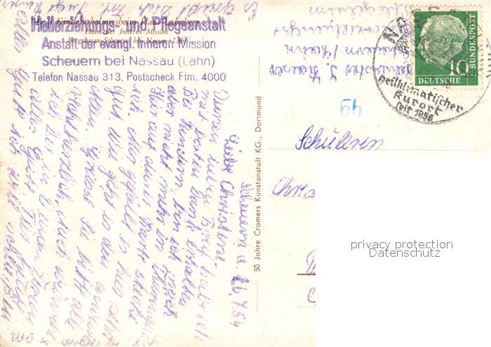 43496725 alte Postkarte Scheuern Nassau Lahn Heilerziehungs Pflegeanstalt innere Mission postalisch gelaufen Erhaltung siehe scans [KathaD81] KatCode: 11110007141091