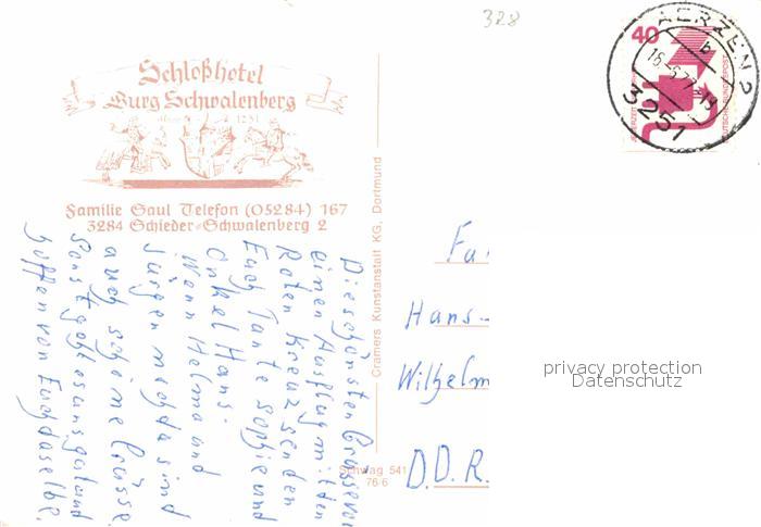72615649 alte Postkarte Schieder-Schwalenberg Schlosshotel Burg Schwalenberg postalisch gelaufen Erhaltung siehe scans [WerneD78] KatCode: 11110005766060