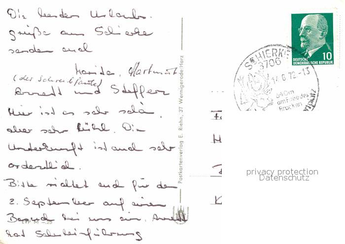 72643483 alte Postkarte Schierke Harz Blick von der Vaupels Klippe FDGB Erholungsheim Franz Mehring Feuerstein Schierkeblick postalisch gelaufen Erhaltung siehe scans [WerneD78] KatCode: 11110015085275