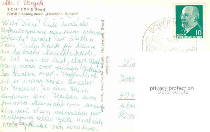 72920153 alte Postkarte Schierke Harz FDGB Erholungsheim Hermann Dunker postalisch gelaufen Erhaltung siehe scans [WerneD78] KatCode: 11110015085275