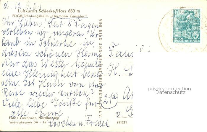 71925178 alte Postkarte Schierke Harz FDGB Erholungsheim Hermann Gieseler Enten postalisch gelaufen Erhaltung siehe scans KatCode: 11110015085275
