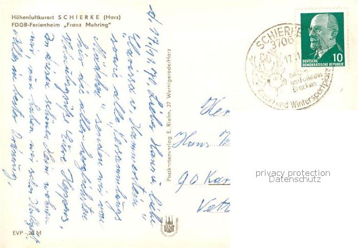 73040066 alte Postkarte Schierke Harz FDGB Ferienheim Franz Mehring postalisch gelaufen Erhaltung siehe scans [KathaD81] KatCode: 11110015085275