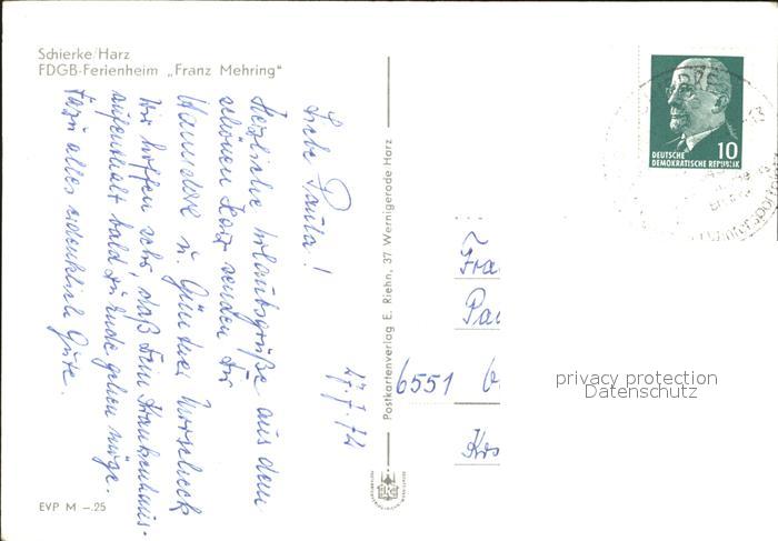 72052807 alte Postkarte Schierke Harz FDGB Ferienheim Franz Mehring postalisch gelaufen Erhaltung siehe scans KatCode: 11110015085275